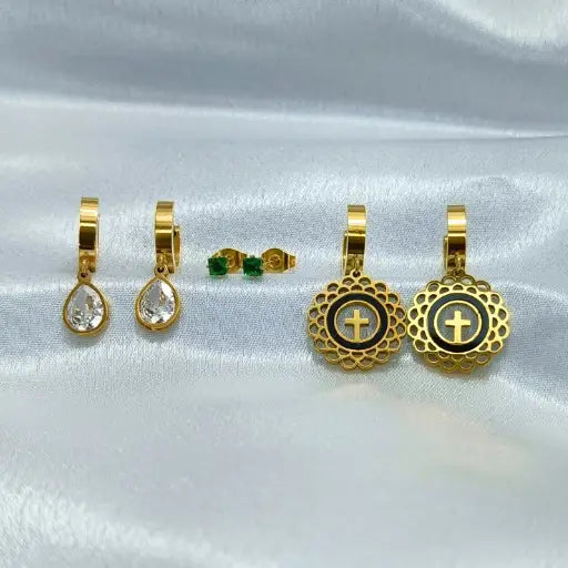 Elevate your style with our demi-fine Divine Glow Earring Combo, a curated trio that blends premium craftsmanship with timeless design. This collection features elegant teardrop dangles with brilliant white stones, minimalist emerald-green studs, and ornate cross-medallion hoops. Crafted from high-quality, anti-tarnish, waterproof, and hypoallergenic stainless steel, this gold-plated set offers the luxury look of fine jewelry with the durability for everyday wear.