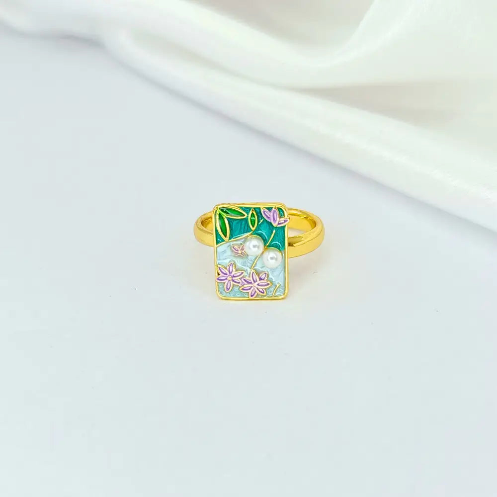 Get lost in a garden of elegance with our demi-fine "Garden Dreams" Ring. This exquisite piece features a rectangular face adorned with a beautiful multi-colored enameled floral design, accented by two delicate faux pearls. Crafted from durable stainless steel with a brilliant gold-plated finish, this ring is completely anti-tarnish, waterproof, and hypoallergenic. The open, adjustable shank provides a perfect and effortless fit, making this unique accessory ideal for adding a touch of natural charm to your style.