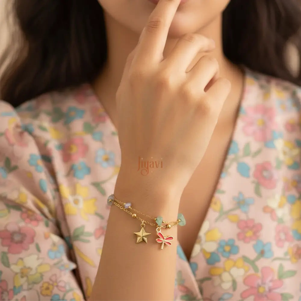 Curated by our jewellery experts, our demi-fine "Enchanted Journey" Charm Bracelet is a story on your wrist. This beautifully layered bracelet features a delicate blend of two gold-plated chains adorned with a whimsical collection of charms, including a bold star, a vibrant dragonfly, and shimmering semi-precious stones. Crafted from durable gold-plated stainless steel, it is completely anti-tarnish, waterproof, and hypoallergenic. This versatile piece adds a touch of bohemian-chic elegance to any look, whether worn alone or stacked for a curated, personal style