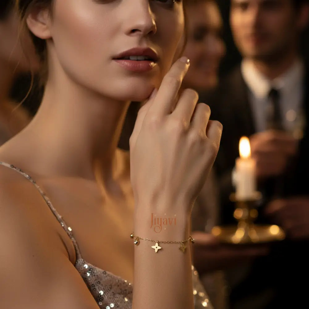 Curated by our jewellery experts, our demi-fine "Lucky Bloom" Charm Bracelet is a delicate piece of wearable art. A fine gold-plated chain is adorned with beautifully spaced four-petal flower charms and sparkling clear stones, creating a light and airy feel. Crafted from durable gold-plated stainless steel, this bracelet is completely anti-tarnish, waterproof, and hypoallergenic. Its dainty design and adjustable fit make it perfect for layering with other bracelets or wearing on its own for a touch of subtle sophistication