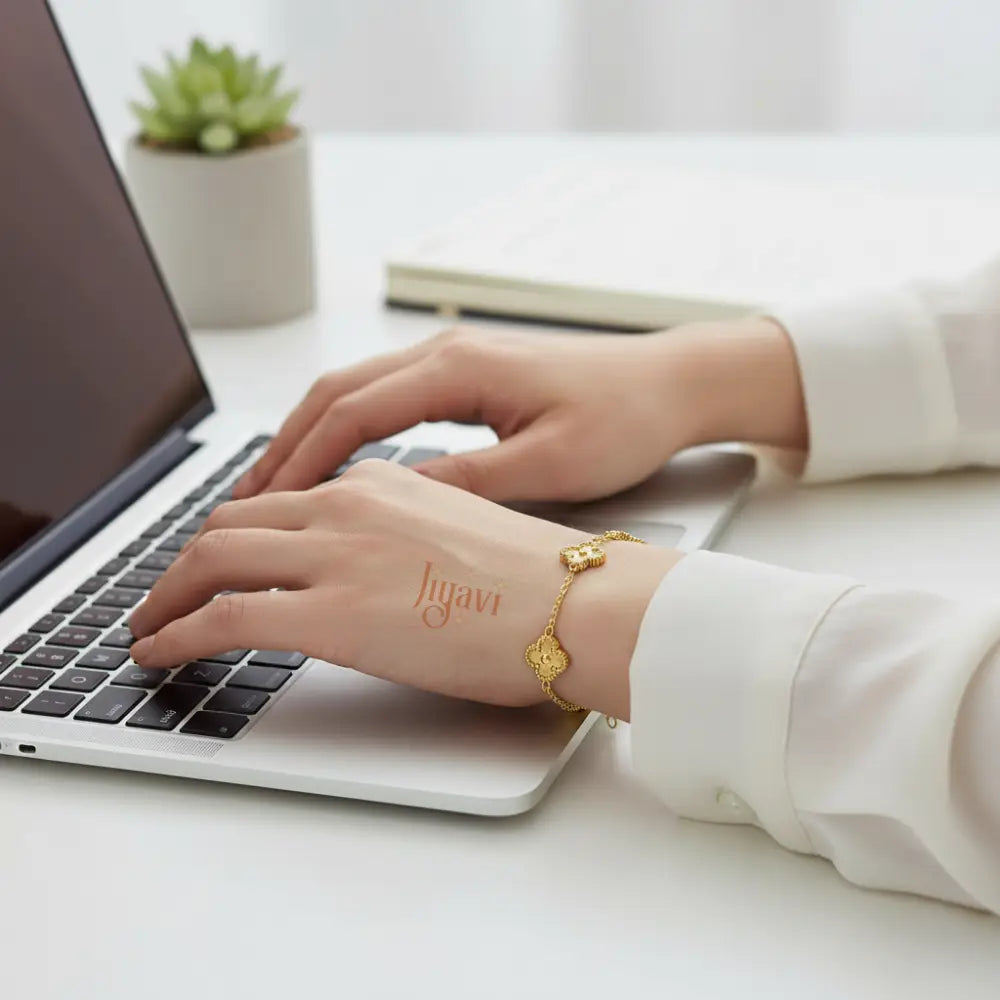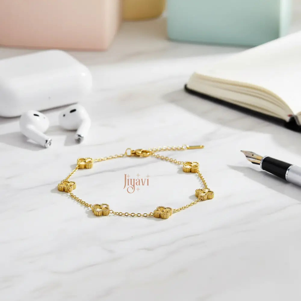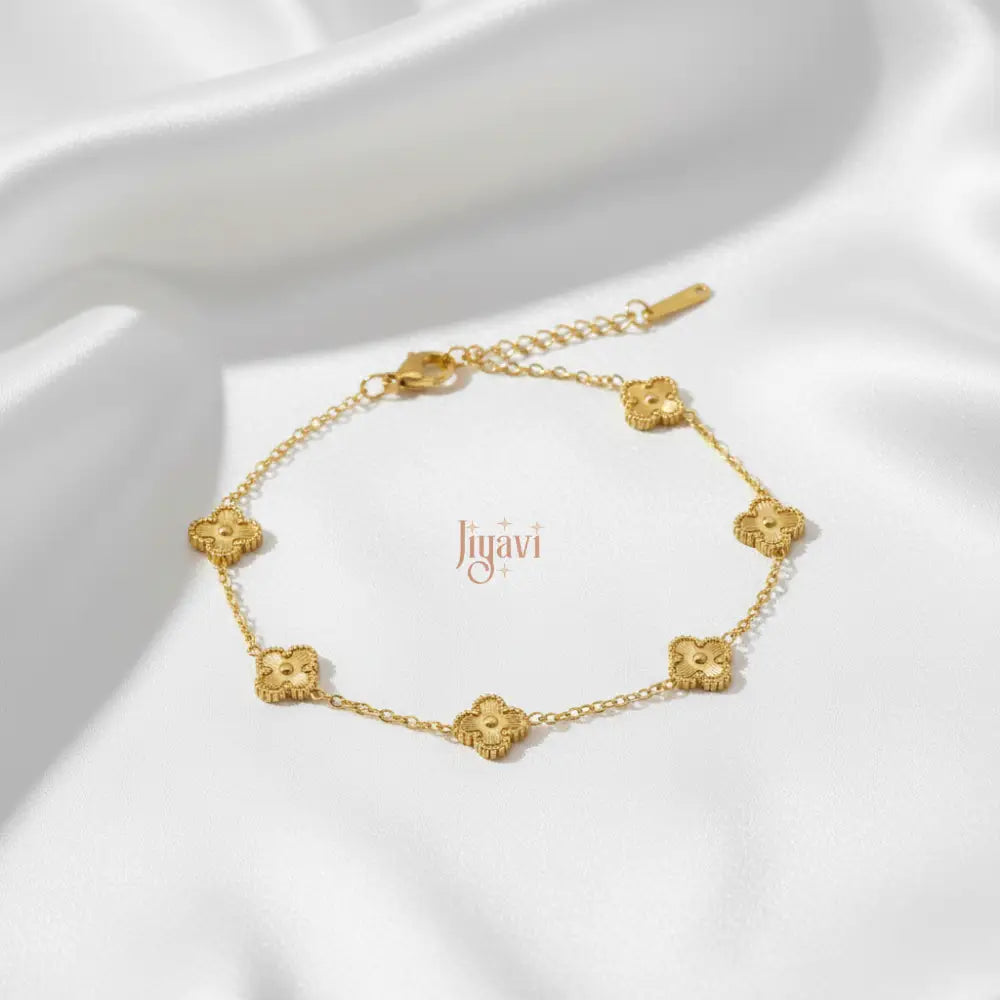 Curated by our jewellery experts, our demi-fine "Lucky Clover" Charm Bracelet is a delicate symbol of good fortune and timeless style. This elegant piece features a fine gold-plated chain adorned with five beautifully spaced four-leaf clover charms, each with an intricate, embossed texture. Crafted from durable gold-plated stainless steel, this bracelet is completely anti-tarnish, waterproof, and hypoallergenic. Its dainty design and adjustable fit make it perfect for layering with other bracelets or wearing on its own for a touch of everyday luck.