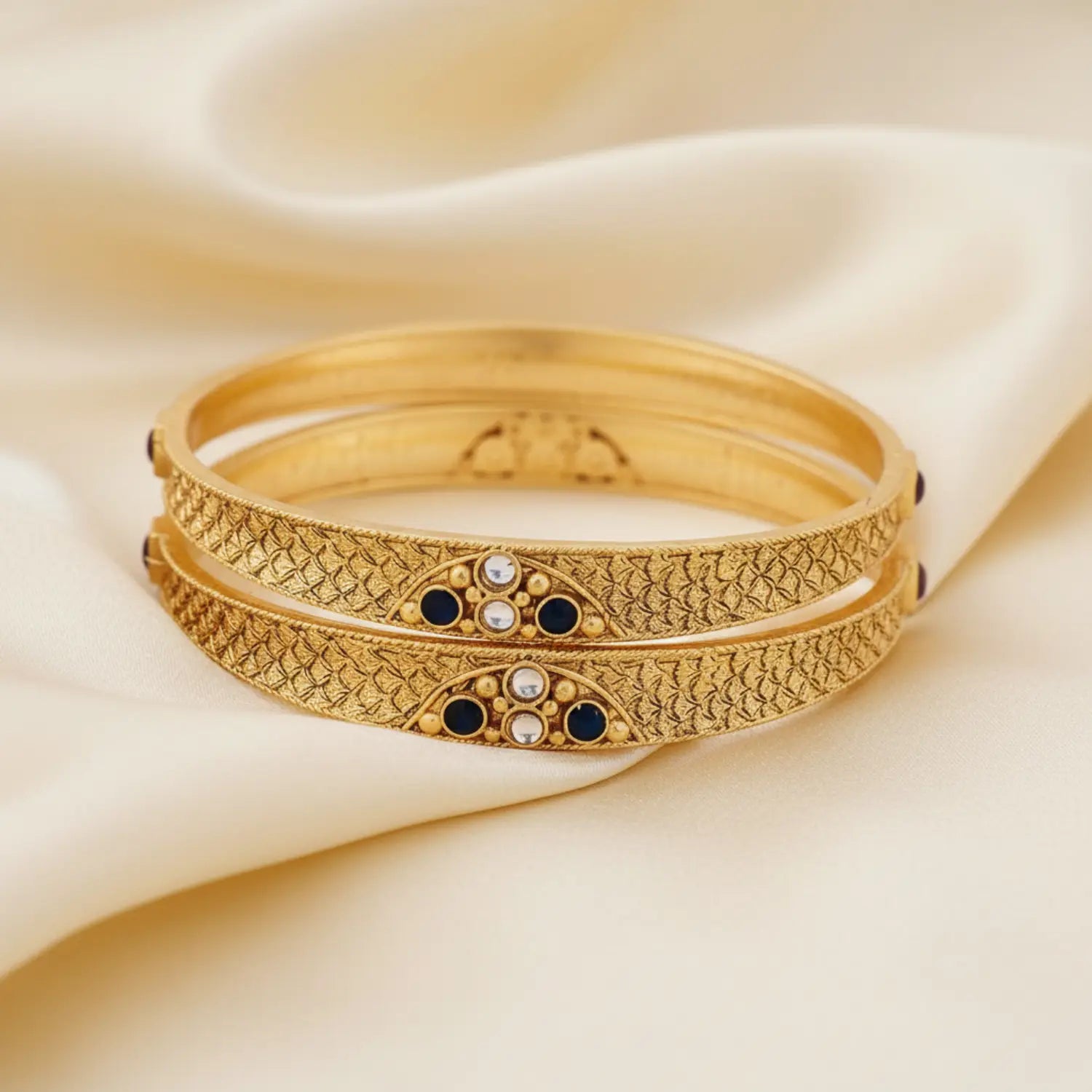 Adorn your wrists with the authentic heritage of our Traditional Gold Plated Bangle Set. These bangles are beautifully crafted on a durable Copper Base Alloy Mix and feature a rich, granulated texture that offers the classic look of antique gold. The highlight is the central panel, which showcases an intricate geometric design set with alternating blue and white enamel dots, reminiscent of classic South Indian Temple Jewellery or Ethnic craftsmanship. Sold as a pair, these bangles are the perfect accessory for weddings, cultural events, or simply adding a touch of traditional luxury to your festive attire.