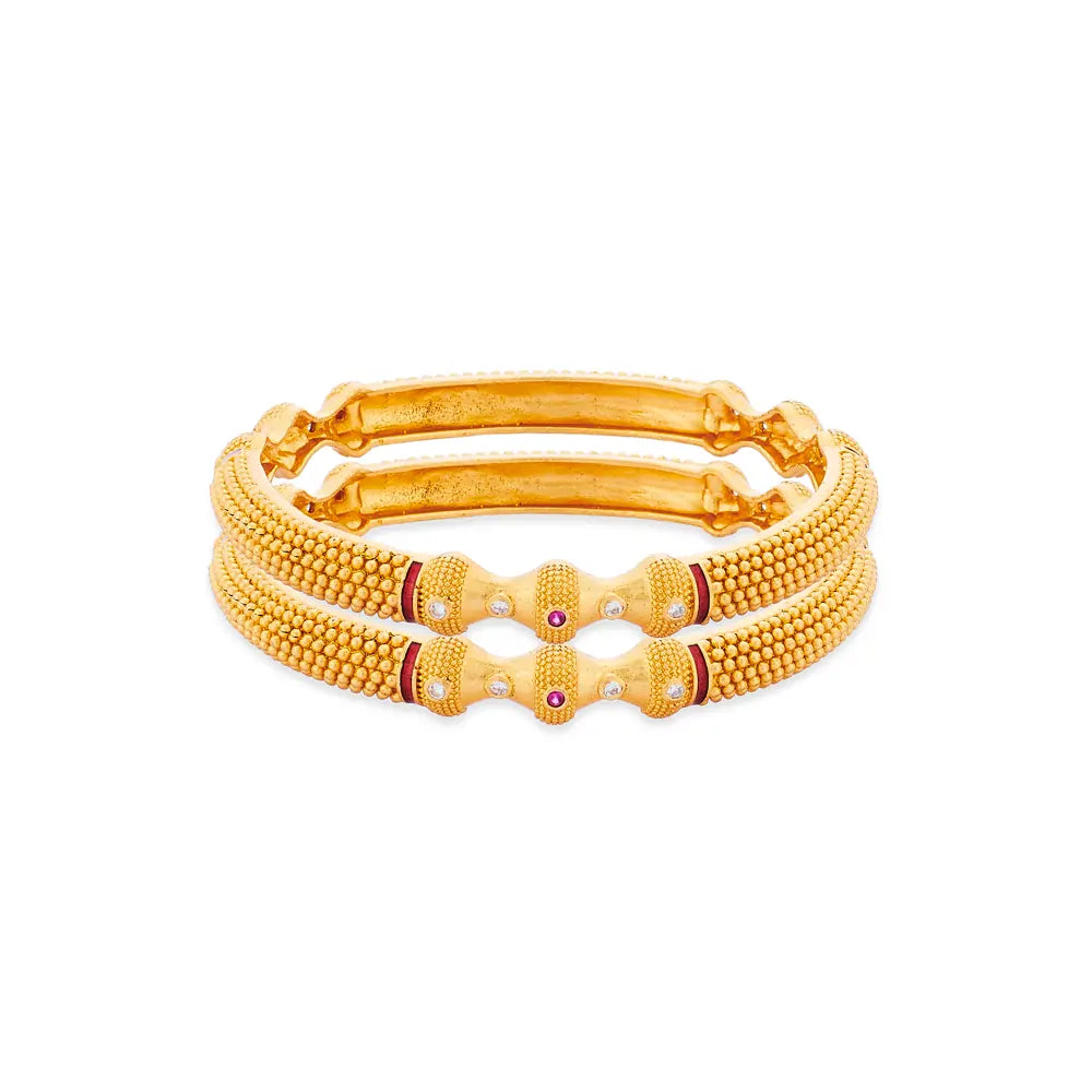 Experience regal luxury with this magnificent pair of Traditional Gold Plated Bangles. Crafted with a rich Copper Base Alloy Mix, these pieces showcase intricate granulated beadwork along the edges for an authentic Temple Jewellery aesthetic. The central design is boldly accented with sparkling white stones and deep ruby-red accents. The generous gold plating offers a rich, luxurious shine, making these a perfect choice for brides and grand festive celebrations. Add a touch of undeniable majesty to your Ethnic ensemble