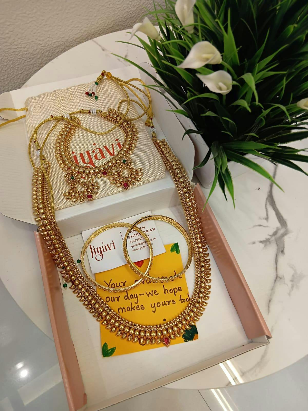 This set is designed for maximum impact; wear both necklaces together to create the perfect layered bridal look over a silk saree or lehenga. The matte finish complements rich silks and heavy embroidery beautifully, offering a grand, antique gold appeal.